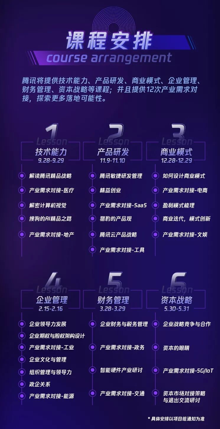 据悉,腾讯将为学员提供技术能力、产品研发、商业模式、企业管理/组织人才、财务管理、资本战略等六次课程;并且导入商机,提供12次不同类型产业需求对接,探索更多落地可能性。